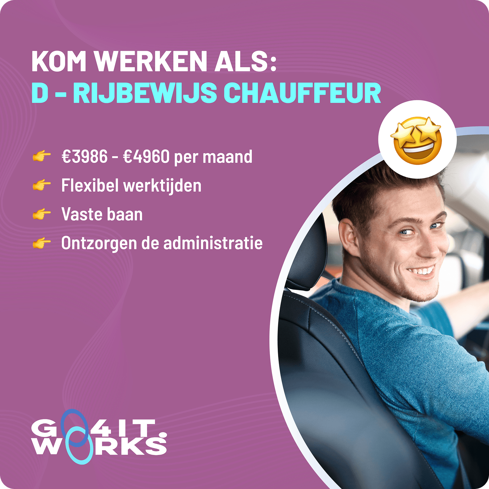 Go4it works een hele mooie bedrijf. De uitdaging last in kwalitatief goede bus chauffeur zoeken ussen concurrende markt, maar de creatieve carrousel advertenties hebben we leads €30 - €50 behouden. Daar zijn we trots op en ervoor gezorgd dat we jaren samen konden werken.